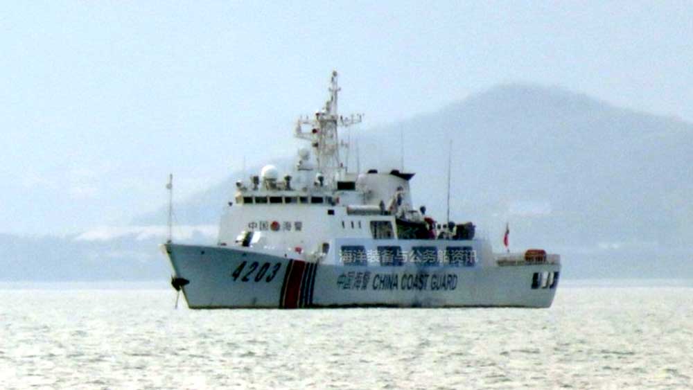 The CCG 4203 is a Zhaojun-class cutter. According to a study from the U.S. Naval War College China Maritime Studies Institute, each Zhaojun-class ship displaces 2,700 tons and is armed with a 76mm canon. MarineTraffic reports that the CCG 4203 is 102 meters long. Satellite imagery confirms that the CCG 4203 is roughly 100 meters in length.